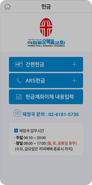 간편헌금 서비스 오픈뱅킹이 도입되어 모든 은행 계좌로 헌금 가능하오니 참고하여 주시기 바랍니다.