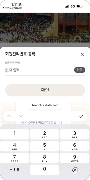 헌금번호 6자리와 이름 정보를 입력하고 확인버튼을 누릅니다.
